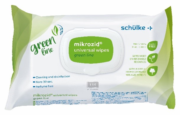 Für die Produktion der Tücher werden ausschließlich Materialien aus FSC-zertifizierter Waldwirtschaft eingesetzt. Die Verpackung besteht zu 22 % aus PIR (Post-Industrial-Rezyklat). Zudem wird ein Großteil der Produktkomponenten in Deutschland gefertigt, dies sorgt für kurze Transportwege. Unter Einsatz von 100%igem Ökostrom in der schülke-Produktion trägt dies dazu bei, dass mikrozid® universal wipes green line einen 25 % kleineren COâ‚‚-Fußabdruck aufweisen als PET-basierte Desinfektionstücher.