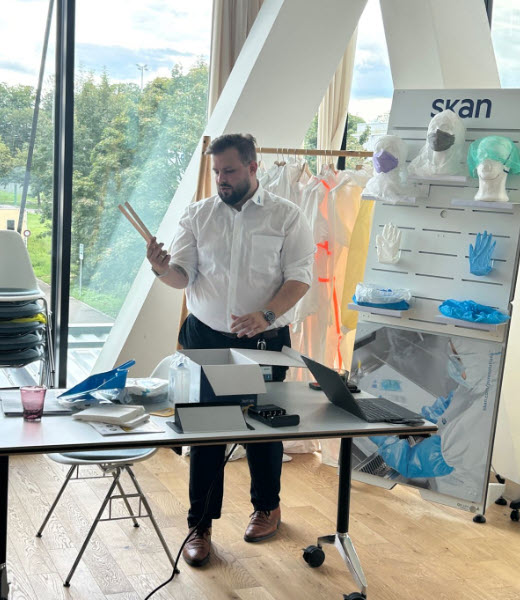 David Marek von der Firma Skan klärte um Persönliche Schutzausrüstung (PSA) auf und nach der zVieripause ging es bei David noch um Workshop: Zyto-Havarie was tun? in den Praxisteil. Herzlichen Dank für die Gastfreundschaft bei der Firma Skan AG.