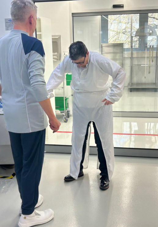 Frederic Buehler von der Dastex Group GmbH zeigte die Bedeutung der Reinraumbekleidung als Schutzbarriere gegen Kontamination. Im praktischen Reinraum-Workshop im Reinraum bei avintos AG wurden Einschleusung und Gowning trainiert sowie typische Fehler analysiert und optimiert. Natürlich kam der Spass beim Gowing nicht zu kurz.