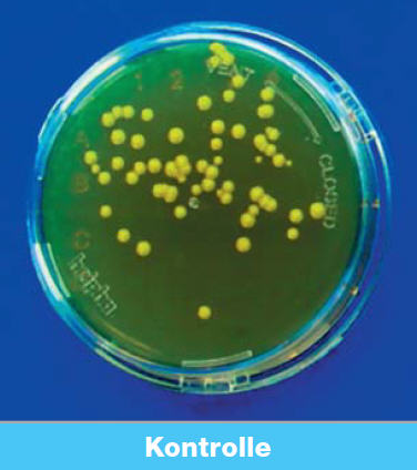Parallel wird für jeden verwendeten Mikroorganismus jeweils eine Inokulum-Kontrolle auf einem entsprechenden Universalmedium angelegt, so z. B. für Bakterien auf Caso-Agar und für Hefenund Schimmelpilze auf Sabouraud-Agar.